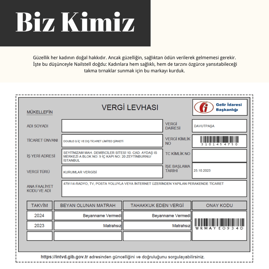 Nailstell, yasal olarak kayıtlı ve tüm faaliyetlerini mevzuata uygun şekilde yürüten güvenilir bir şirkettir. Müşterilerimizin ve iş ortaklarımızın güveni bizim için her şeyden önemlidir.